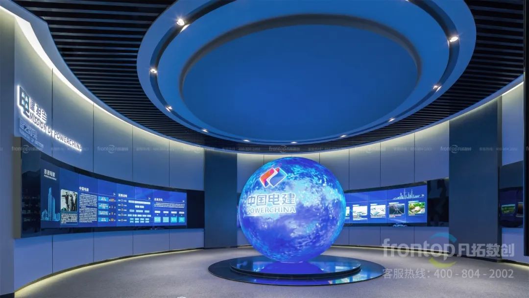 全球品牌展示區,通過球幕結合數字展墻的立體視效組合生動展現中國電建集團的品牌綜合實力。