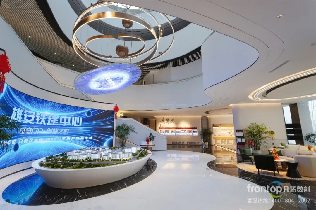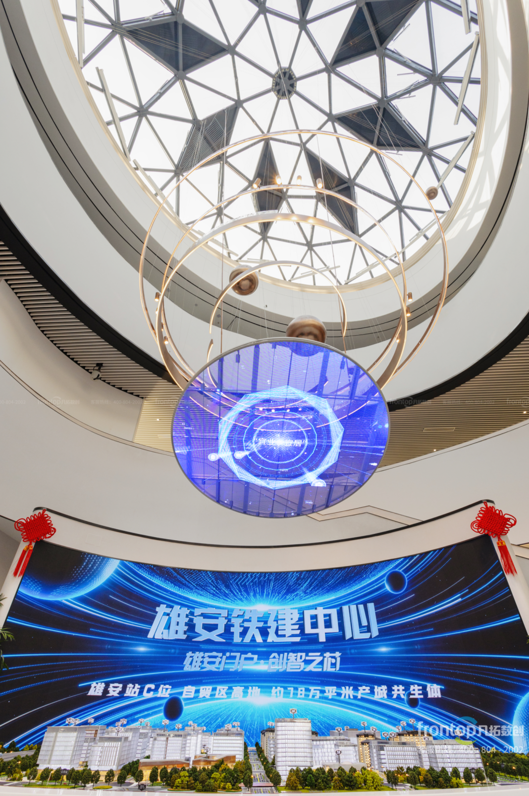 三層挑空的藝術裝置組合作為整個空間的流線核心和視覺主體,全面展示雄安鐵建中心項目總體規劃、區位優勢、交通配套,賦予世界TOD門戶樣板發展前景更開闊的尺度。
