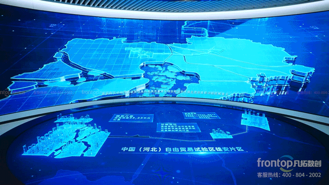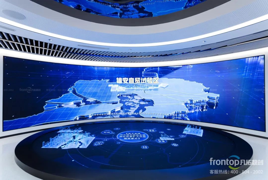 以創新新高地為設計理念,打造雄安自貿區的規劃展示高地。立足當下,展望未來,雙屏聯動展示雄安自貿區總體規劃、交通優勢、空間布局、產業發展規劃等建設情況。