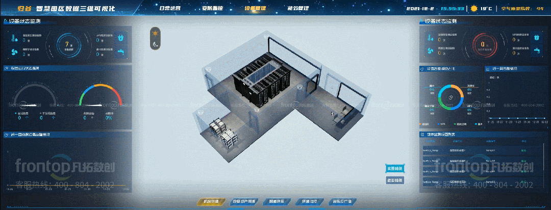 可視化系統(tǒng)實(shí)時(shí)檢測(cè)各空間設(shè)備在空間中分布及運(yùn)行狀況、設(shè)備運(yùn)營等統(tǒng)計(jì)數(shù)據(jù)。AI智能預(yù)測(cè)設(shè)備故障,并可一鍵定位到設(shè)備具體位置查看告警詳情。