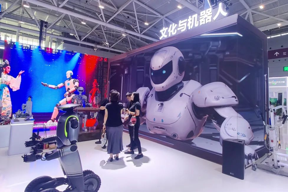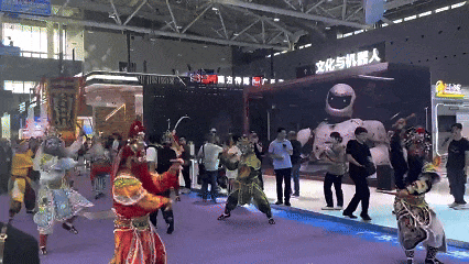 結合開展首日的英歌舞表演,裸眼3D大屏中機器人跟隨現場機器人一同手舞足蹈,鼓掌助興,線上下聯動相映成趣,文化與科技的融合在這一刻得到了完美的體現。