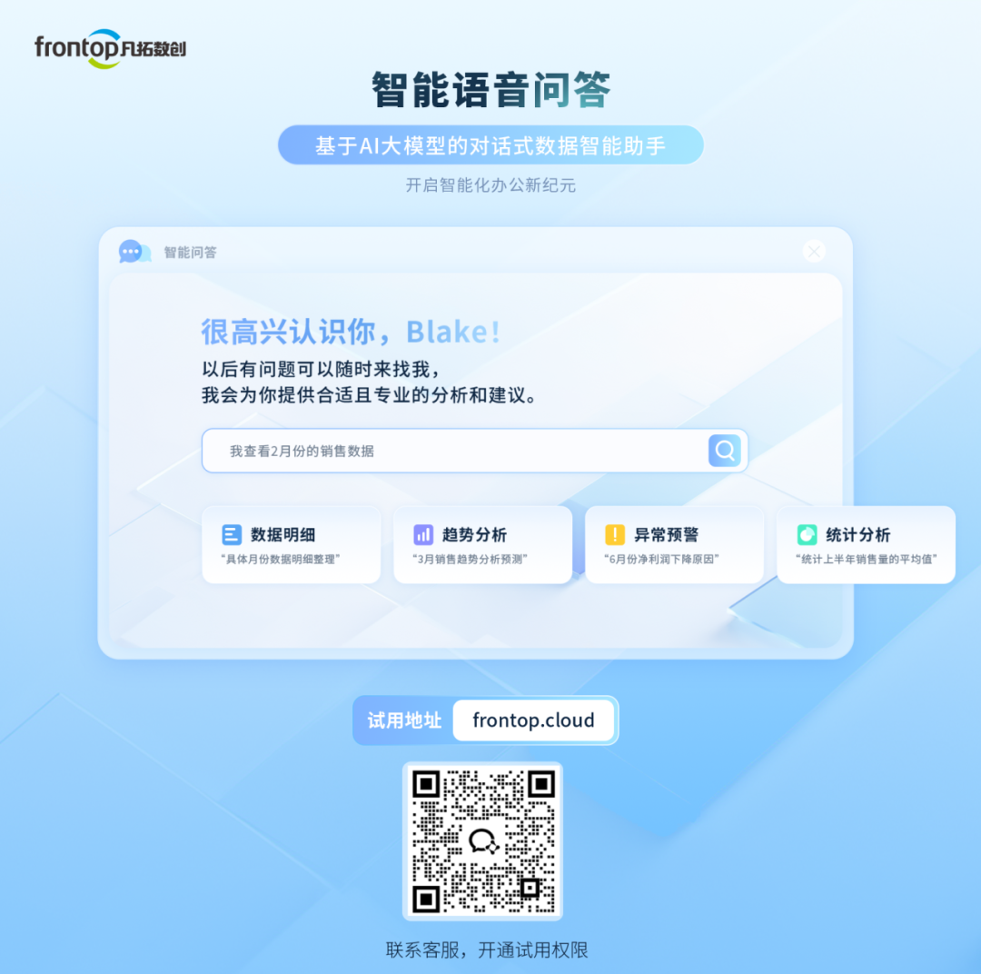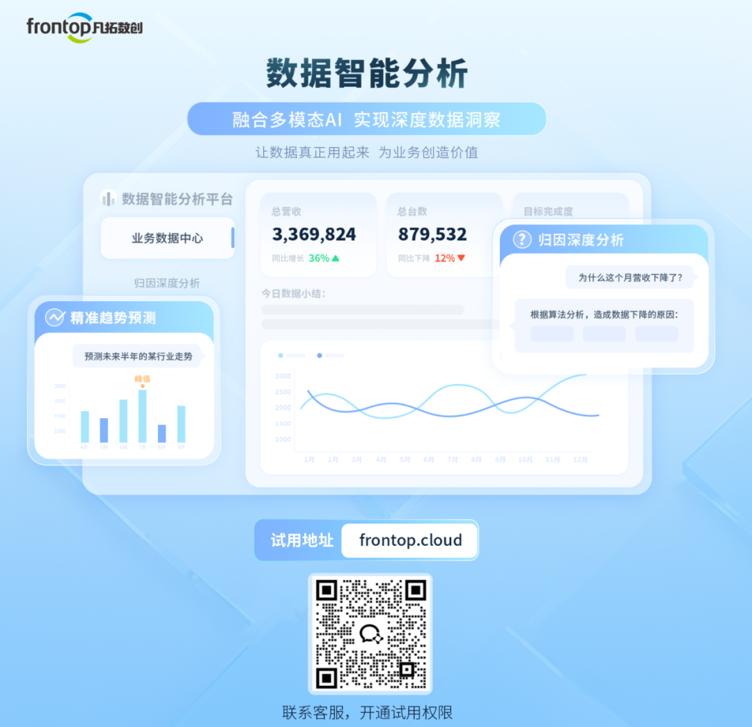 將AI模型集成到凡拓ChatBI底層架構中,讓產品更準確理解用戶提出的數據分析需求,即便是語句結構復雜、語義模糊的提問都能準確捕捉用戶意圖,自動識別業務指令,生成圖表、分析報告及數據洞察。