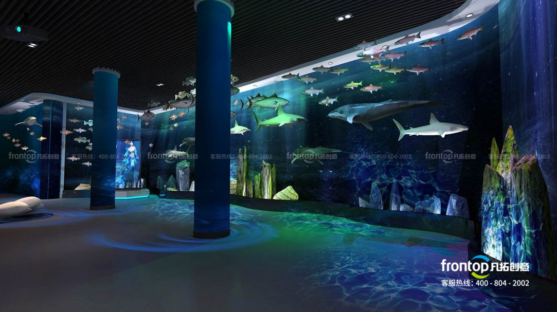 凡拓數創承接了江西九江大千世界海洋館的設計施工一體化工程,通過數字多媒體科技,比如三維動畫虛擬、互動多媒體、增強現實技術,帶領人們于游玩中探索海洋奧秘,成為科普教育與游樂探索的相結合。其中,采用了數字化海底隧道虛擬仿真系統。